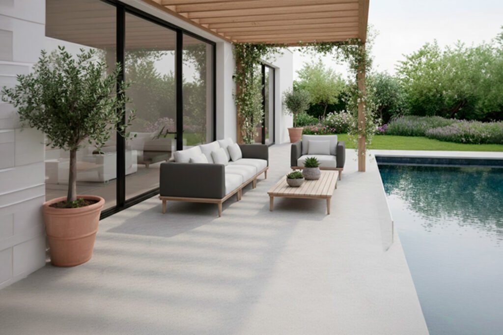 Los sistemas decorativos para exterior están formulados para resistir la intemperie, la radiación UV y los cambios térmicos, manteniendo el color y las propiedades antideslizantes.