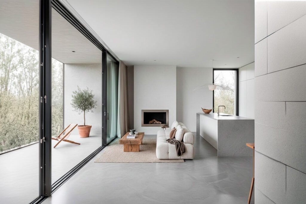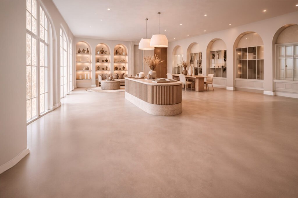 En interiores, el pavimento decorativo debe aportar una imagen elegante, confort de pisada y resistencia al desgaste, manteniendo una estética limpia y atemporal.