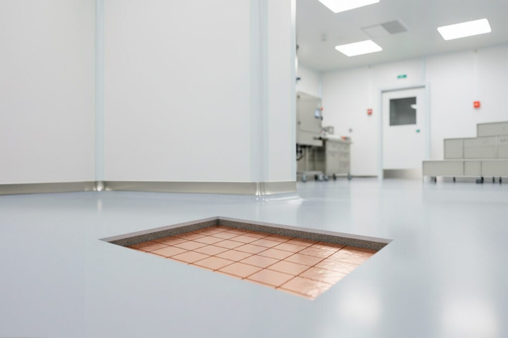 - Pavimentos Disipativos/Conductores: Estos suelos incorporan una red de hilos de cobre conectada a tierra. Su función es conducir la electricidad estática del cuerpo humano o de las máquinas hacia el suelo de forma segura.