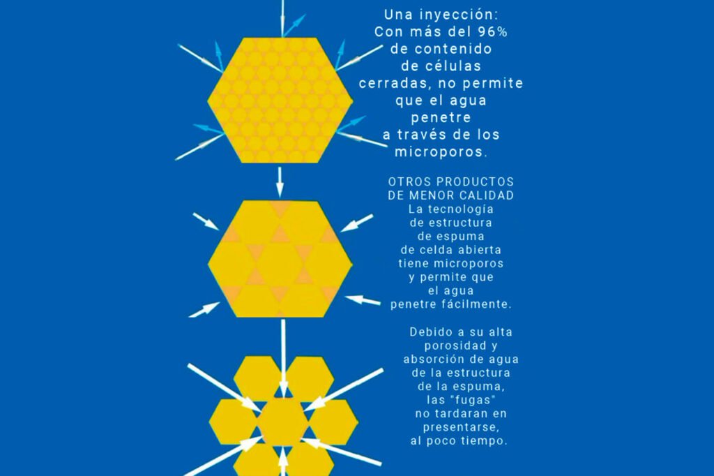 Resina de inyección bicomponente no espumante. Reacciona en ambiente seco y crea una junta semi deformable. En contacto con el agua, crea una espuma flexible de hasta 2 veces su volumen.